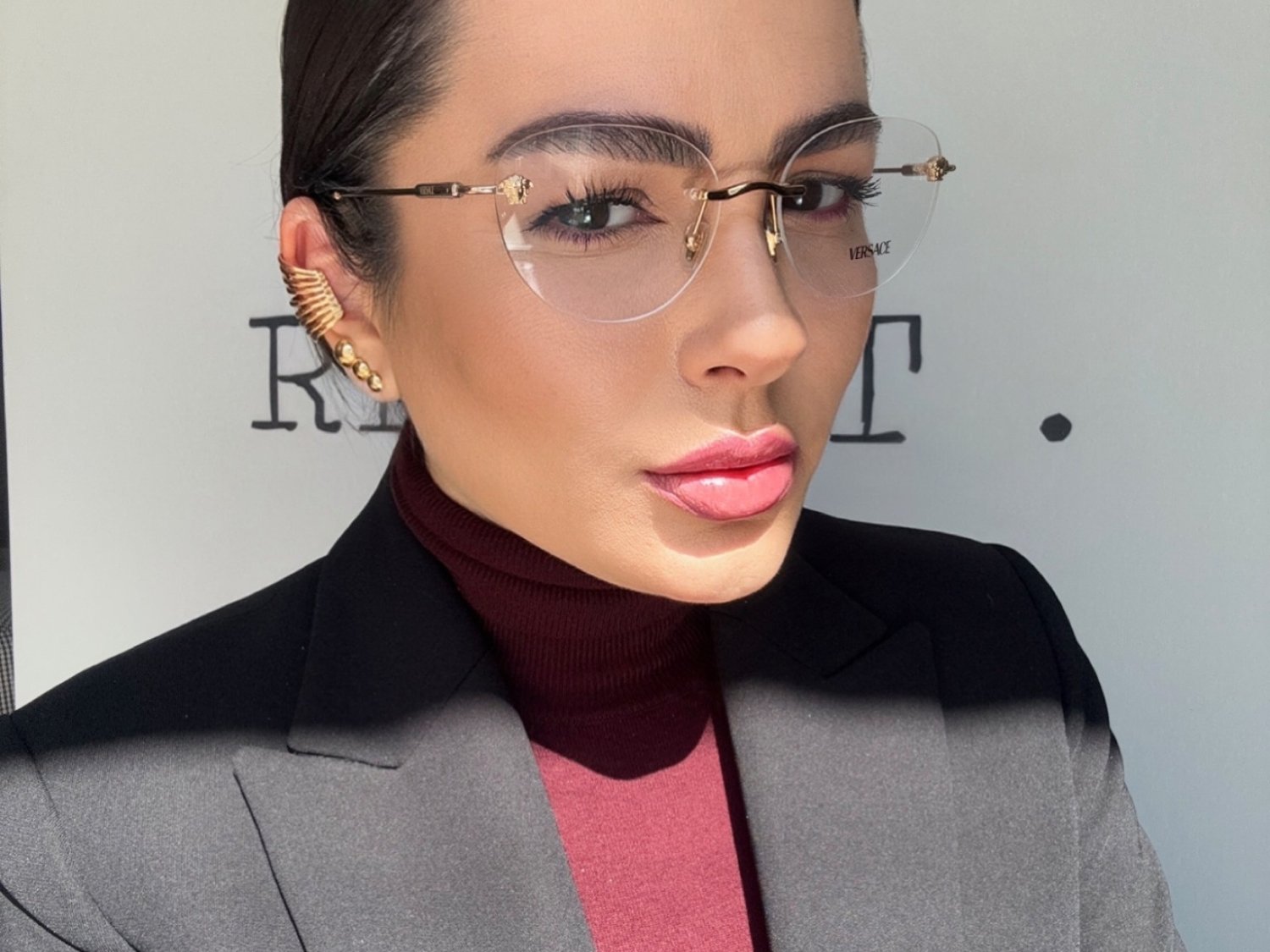 - Detalhes: Armação sem aro com decoração da Medusa e hastes metálicas com logo gravado a laser